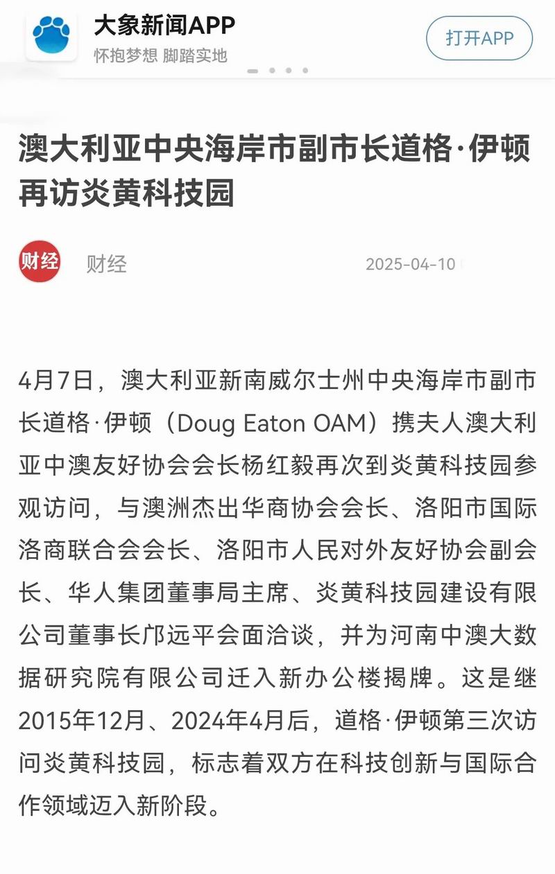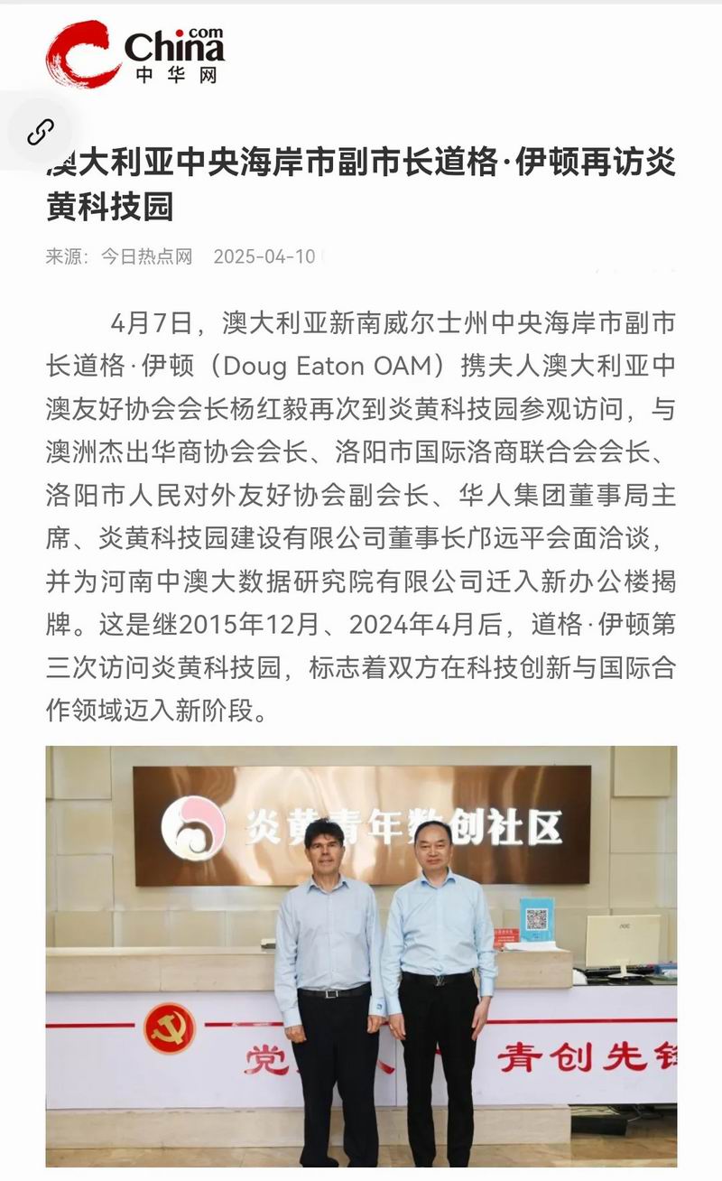 4月7日,澳大利亞新南威爾士州中央海岸市副市長(zhǎng)道格·伊頓(Doug Eaton OAM)攜夫人澳大利亞中澳友好協(xié)會(huì)會(huì)長(zhǎng)楊紅毅再次到炎黃科技園參觀訪問(wèn),與澳洲杰出華商協(xié)會(huì)會(huì)長(zhǎng)、洛陽(yáng)市國(guó)際洛商聯(lián)合會(huì)會(huì)長(zhǎng)、洛陽(yáng)市人民對(duì)外友好協(xié)會(huì)副會(huì)長(zhǎng)、華人集團(tuán)董事局主席、炎黃科技園建設(shè)有限公司董事長(zhǎng)鄺遠(yuǎn)平會(huì)面洽談,并為河南中澳大數(shù)據(jù)研究院有限公司遷入新辦公樓揭牌。這是繼2015年12月、2024年4月后,道格·伊頓第三次訪問(wèn)炎黃科技園,標(biāo)志著雙方在科技創(chuàng)新與國(guó)際合作領(lǐng)域邁入新階段。