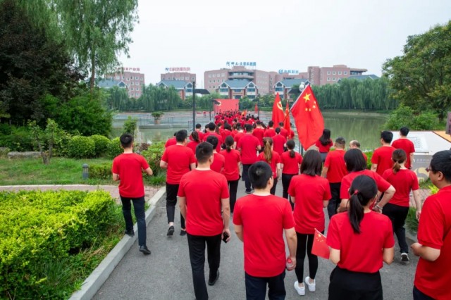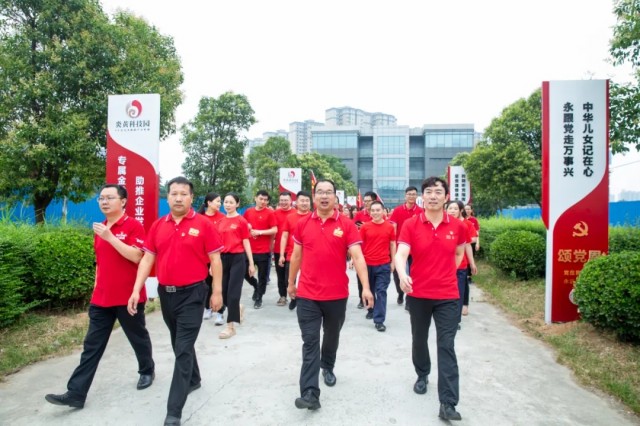 蔚藍的天空下,闊大的中心湖平臺上,一面鮮艷的黨旗高高聳立。兩名旗手高舉黨旗和國旗,沿著炎黃科技園黨建長廊向平臺飛奔而來。
